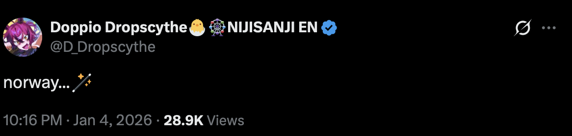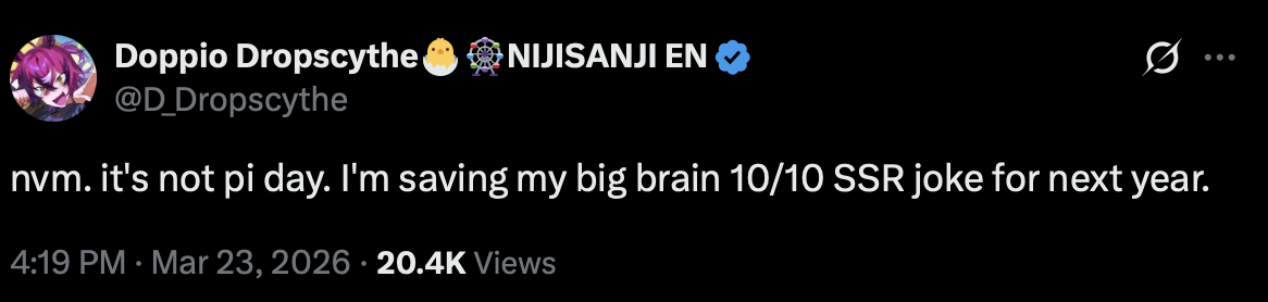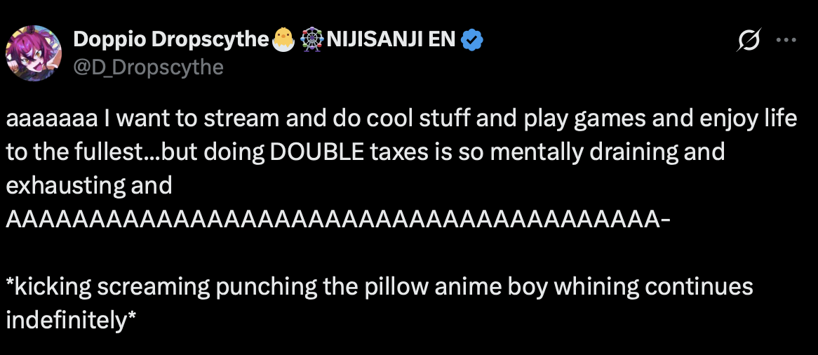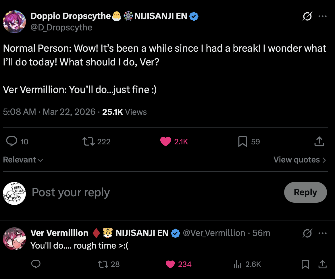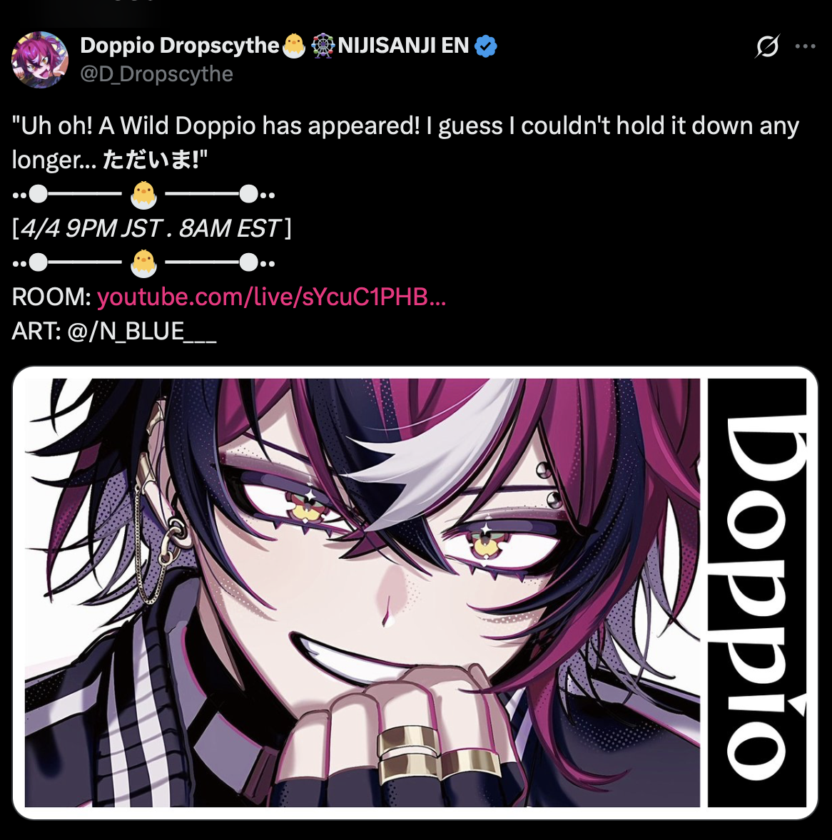 Doppio Dropscythe is a Vtuber that streams on youtube. He is part of the (horrible) company Nijisanji, specifically the English branch. It is all owned by Anycoolor (disgusting). Usually corporate vtubers debut with a wave, doppio is part of XSOLEIL, the 7th wave of Nijisanji EN. He is one of the 3 "alive" members, with 3 others who have graduated, while 1 was terminated.